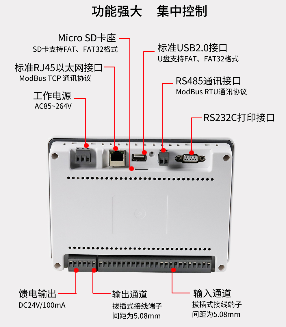彩色無紙記錄儀/溫度記錄儀采用新型大規(guī)模集成電路,對(duì)輸入、輸出、電源、信號(hào)采取可靠保護(hù)和強(qiáng)抗干擾設(shè)計(jì)。8路萬能信號(hào)輸入(可組態(tài)選擇輸入:標(biāo)準(zhǔn)電壓、標(biāo)準(zhǔn)電流、熱電偶、熱電阻、頻率、毫伏等)??蓭?路報(bào)警輸出,1個(gè)饋電輸出,RS485通訊接口,以太網(wǎng)接口,微型打印機(jī)接口和USB接口,SD卡插座。