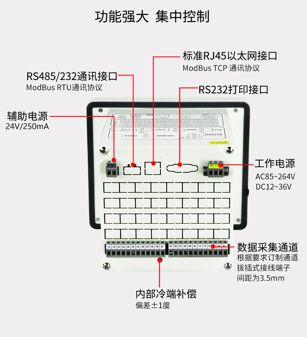 彩色無紙記錄儀/溫度記錄儀用新型大規(guī)模集成電路,對輸入、輸出、電源、信號采取可靠保護和強抗干擾設計。48路萬能輸入??蓭S232/485通訊接口,以太網接口,微型打印機接口和USB接口,SD卡插座;可提供傳感器配電;具有強大的顯示功能,實時曲線顯示,歷史曲線追憶,棒圖顯示等。
