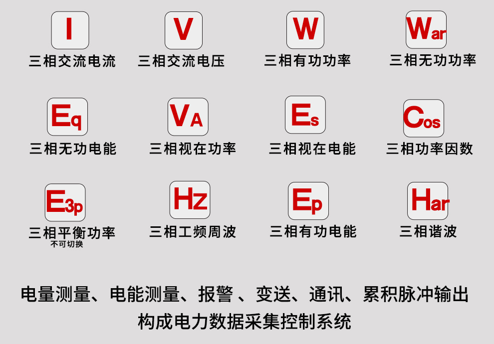三相綜合電量表采用大規(guī)模集成電路和高亮度長壽命的LED顯示器,應(yīng)用數(shù)字采樣技術(shù),對(duì)三相電氣線路中的相電壓、線電壓、相電流、線電流、有功功率、無功功率、視在功率、頻率、功率因數(shù)、等進(jìn)行實(shí)時(shí)測(cè)量顯示與控制。